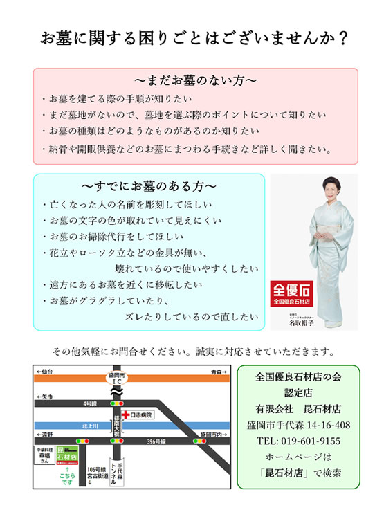 お問合せ お気軽にお問い合わせ下さい。(お返事に数日お時間を頂く場合がございます。) [ 昆石材店 プライバシーポリシー ] お問い合わせ区分 ※必須 お問い合わせ リフォームについて オーダーメイド墓石について 資料請求 (イメージ) お名前 ※必須 ふりがな 会社名 お電話番号 ※必須 メールアドレス ※必須 半角英数でご記入をお願い致します。 メールアドレス (再確認) 半角英数でご記入をお願い致します。 郵便番号 ※必須 住所 ※必須 お問い合わせ内容 ※必須 お問い合わせ内容をご記入してください。 「個人情報保護方針」に同意する